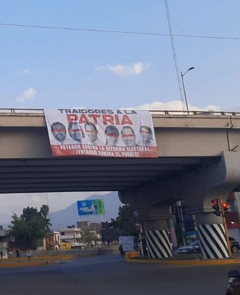 Tal parece que la subcultura del narcotráfico ya alcanzó a algunos militantes de Morena en Oaxaca, al colocar lonas colgadas en al menos ocho puentes peatonales en las que se exhiben las fotos de los legisladores oaxaqueños federales que se abstuvieron o votaron en contra de la reforma electoral de la presidenta de la república, Claudia Sheinbaum Pardo. Con “iniciativa propia” mandaron a elaborar lonas con las imágenes de los legisladores federales Alejandro Avilés Álvarez y Raúl Bolaños Cacho Cué, Margarita García García, Maribel Martínez, Aracely Cruz y Alejandro López Sánchez. “No votaron contra la reforma electoral, votaron contra el pueblo”, dicen los “duros” y agregan: “son traidores”.